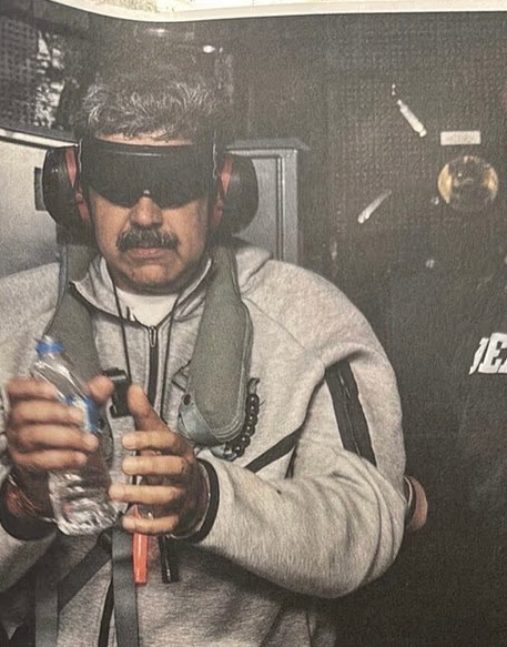 To the left, you see a photograph of Maduro after his capture. President Trump shared this photo on his social media platform. This picture will likely be considered inflammatory by Venezuela and its allies. Nothing good can ever come from that.